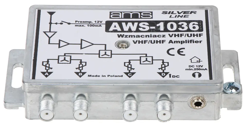 AWS-1036 is designed to amplify and divide the TV signal into 4 home antenna installations built with the use of band antennas connected by a crossoverDepulation allows you to adjust the signal level throughout the installation