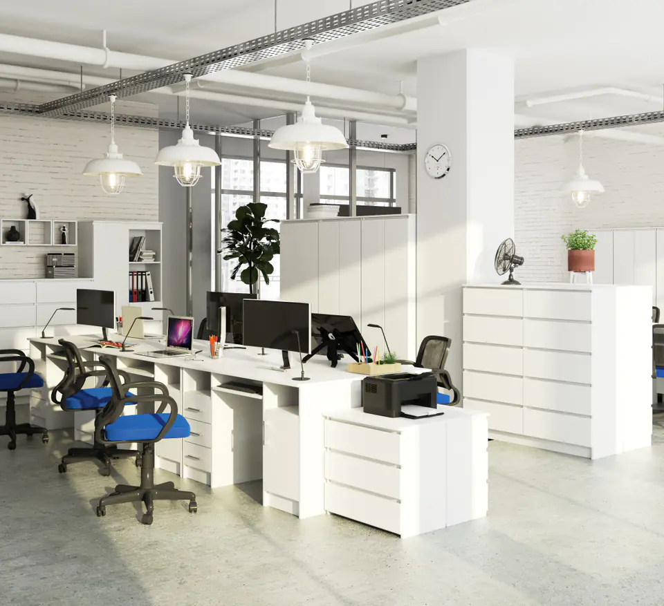 What to consider when choosing the perfect desk for your home office or teenager's room? How to choose a product that will combine good quality, practical application and universal design? It is worth reaching for classic proposals maintained in timeless colors. Definitely one of such colors is white, which has always been very popular among customers. We present you a beautiful white desk of small size, which will work well in any room. It is a model that will satisfy lovers of classically designed interiors who focus on single-color, free-standing desks designed for work or study. The model we recommend consists of capacious drawers, two open cabinets and a lockable cabinet. It also has a pull-out shelf for the keyboard. The space can be developed according to your needs. To create a perfect whole, customers can choose other elements of office interior equipment that have been maintained in the same style.