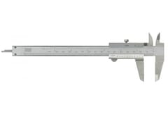 4-function. Stainless steel. Chrome graduation on matt. Scaled in mm and inches. With depth gauge and jaws for internal measurements.