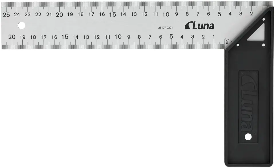 Solid and precisely made workshop angle. Example arm injection molded from ABS plastic. The width of the exemplary is up to 18 mm, which increases stability, and also allows the control of, for example, planed dimensional squares with rounded edges. 1.5×45 mm stainless steel measuring arm with deeply etched graduation in mm. Accuracy ±0.06°. Hole for attaching tool protection.