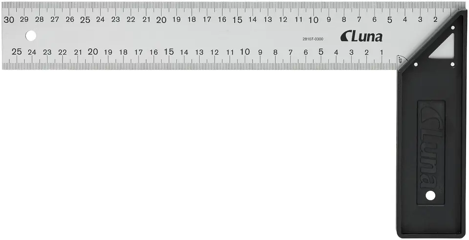 Solid and precisely made workshop angle. Example arm injection molded from ABS plastic. The width of the exemplary is up to 18 mm, which increases stability, and also allows the control of, for example, planed dimensional squares with rounded edges. 1.5×45 mm stainless steel measuring arm with deeply etched graduation in mm. Accuracy ±0.06°. Hole for attaching tool protection.