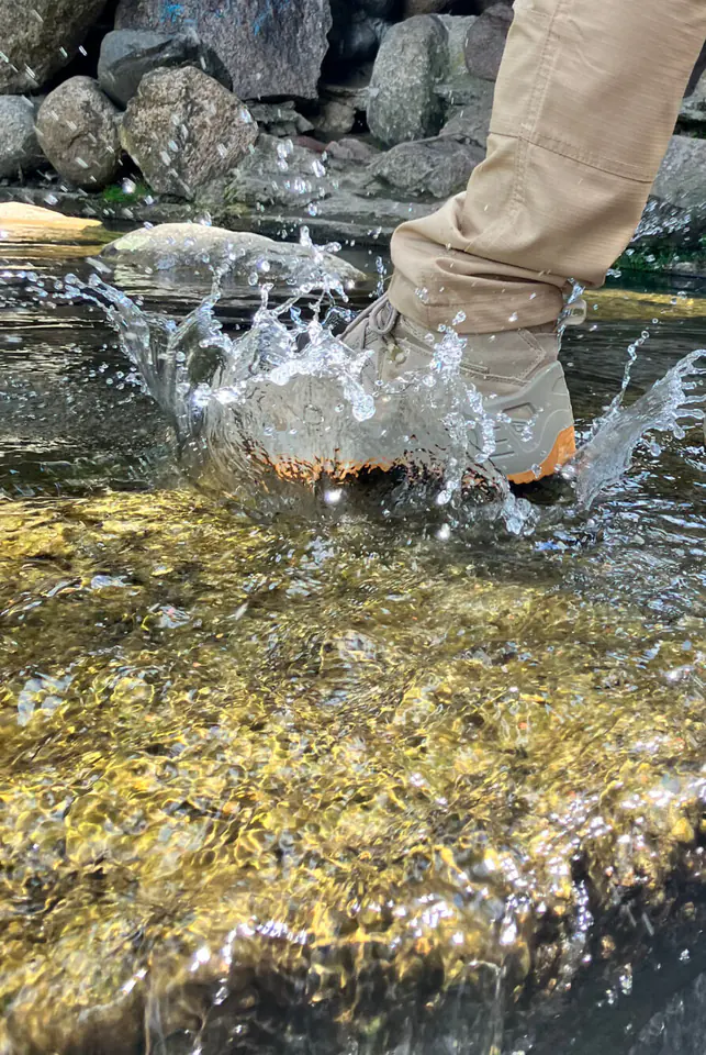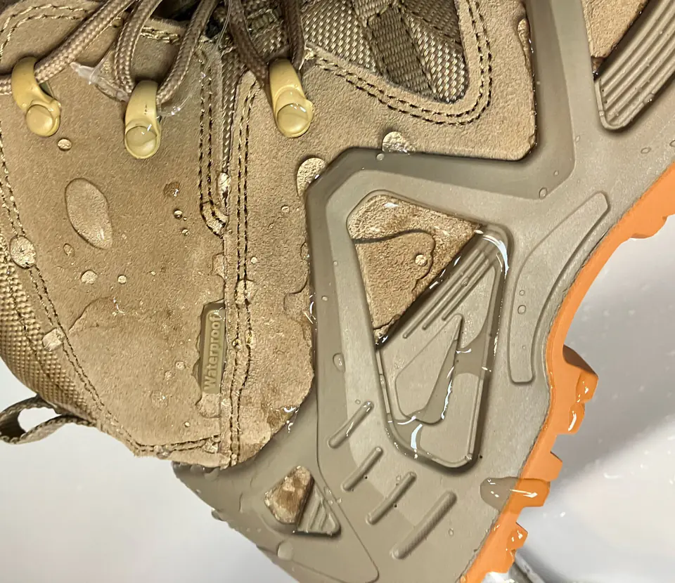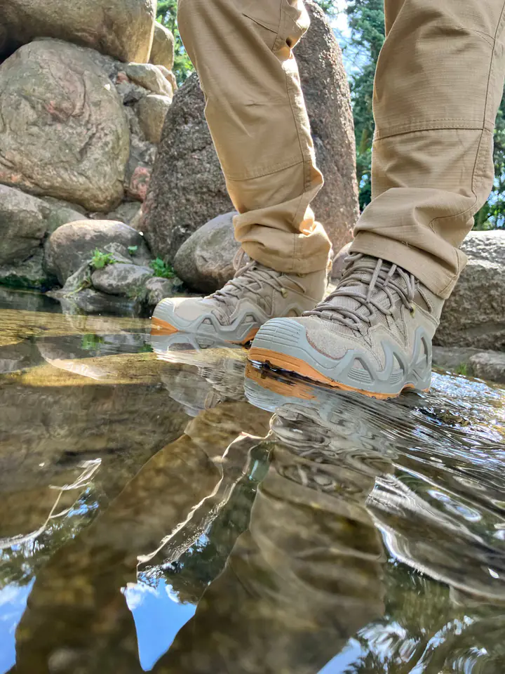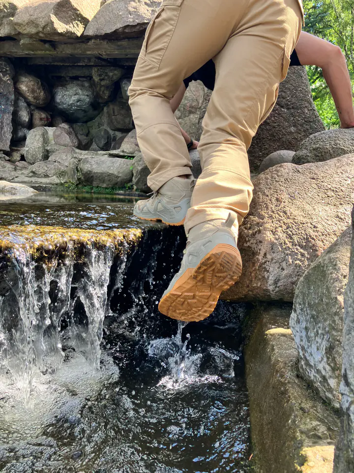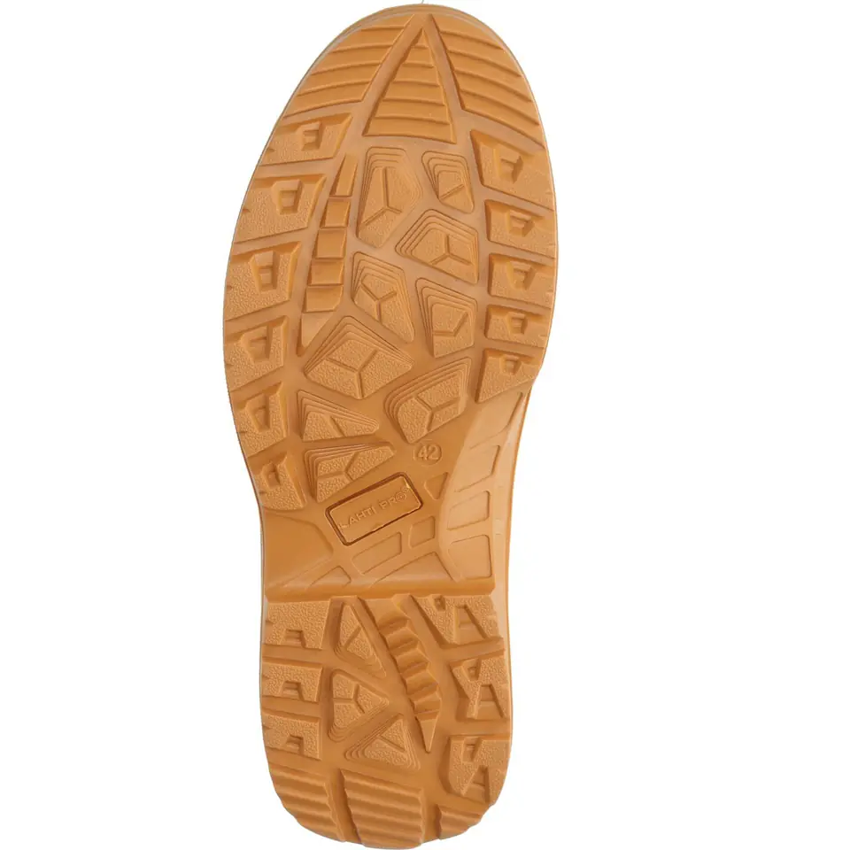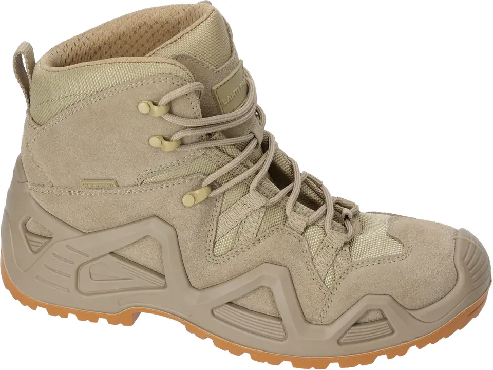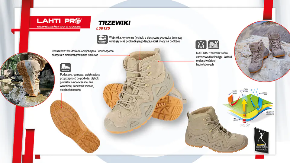 - MATERIAL: Top: suede leather/Oxford type fabric with hydrophobic properties. Lining: built-in breathable and waterproof membrane/mesh knit sock. Insole: replaceable (insoles with a flexible shock-absorbing cushion and a pad mitigating the pressure of the foot on the ground). Sole: rubber, increasing adhesion to the ground, a deep protector with a modern design line ensures high stability of the footwear