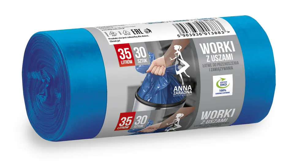 Eco-friendly blue garbage bags with ears for packing all household waste and garbage. The bags are made of thick LDPE film made of regranulate, making them extremely resistant to loads and accidental tears. Garbage bags have the so-called starry bottom weld, thanks to which the bottom of the bag is extremely tight and the bag itself fits perfectly into round waste containers. Thanks to the practical "ears" you can easily tie and move the bag. They are ideal for home, offices, public places. They fit most small waste containers. The use of small bags facilitates waste segregation. The package contains 30 bags with a capacity of 35 L.