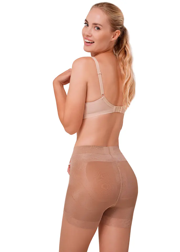 Rajstopy typu PUSH-UP, 20 den, z częścią majtkową 140 den. Modelują sylwetkę, podnoszą pośladki i wyszczuplają talię.