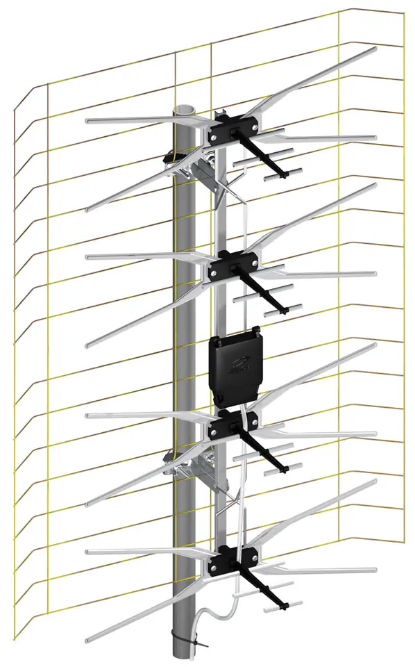 The ASP-8 broadband antenna with symmetrizer (20 elements) receives DVB-T/T2 TV signals in the VHF band and UHF in horizontal polarization.