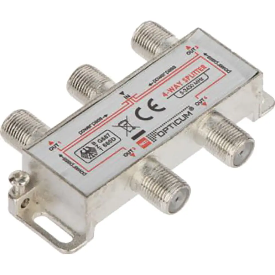 4-fold splitter operating in the range of 5-2400 MHz (designed for DVB-T/T2, DVB-S2). It lets tensions through.