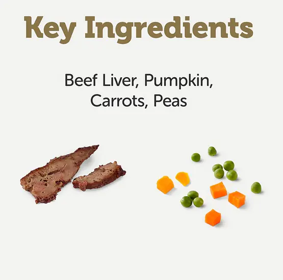 Chicken Breast 28%, Beef Liver 15%, Pumpkin 8%, Carrot 8%, Green Peas 8%, Rice 5%, Chicken Broth 28%.