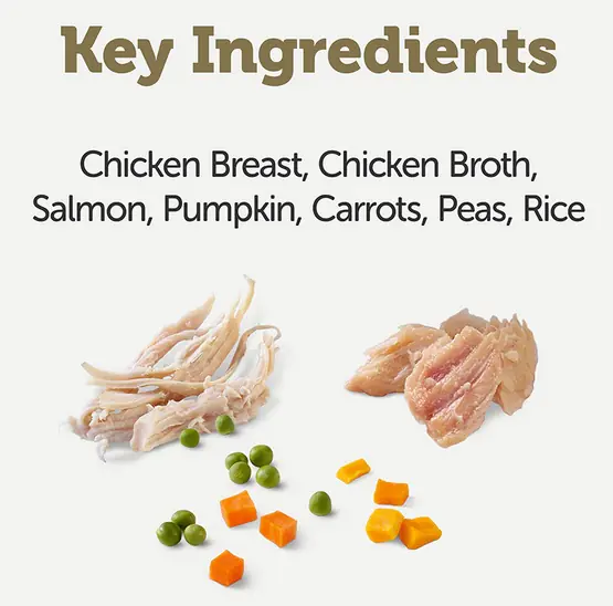 Chicken Breast 28%, Salmon 17%, Pumpkin 8%, Carrot 8%, Green Peas 8%, Rice 5%, Chicken Broth 26%.