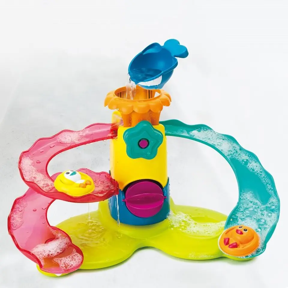 Mini aquapark with two slides and moving elements. The toy floats on the surface of the water. Includes two animals on inflatable boats and a whale-shaped spoon for pouring water. The perfect toy for bathing.