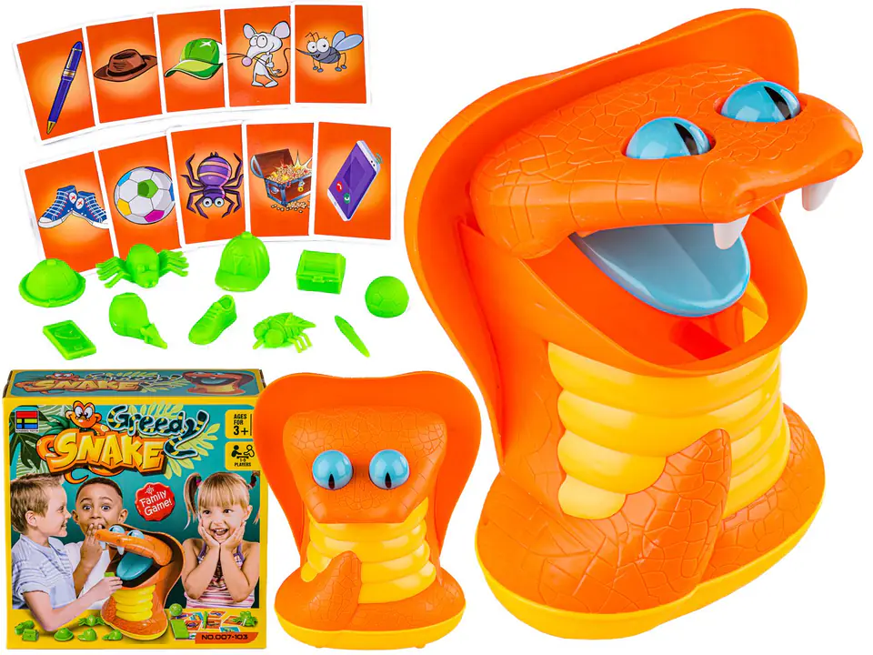 The rules of the game are very simple. First you need to open the mouth of the snake and put in its belly the items that we will draw. Each player draws a card with an item in turn. Now all that remains is to remove the random item from the maw. Remember that this is a snake that can bite at any time. He is very hungry, so he will not last too long with an open mouth :) The winner is the person who takes out the random items while avoiding the bite.