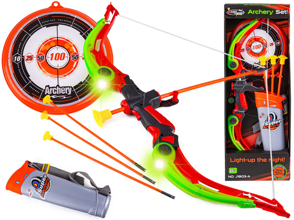 Archery set, glow-in-the-dark bow + accessories, arrows, shield