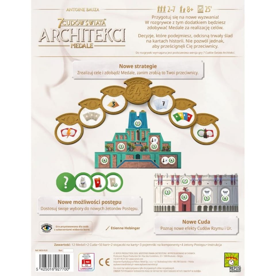 Architects of the 7 Wonders of the World: Medals is an expansion that introduces two more wonders (the Colosseum in Rome and the Ziggurat in Ur), four additional progress tokens, and a brand new game element: the eponymous medals. These are objectives that provide the player with extra points if they complete them before their neighbours. They give us the opportunity to try out completely new strategies, although the basic victory conditions remain the same.