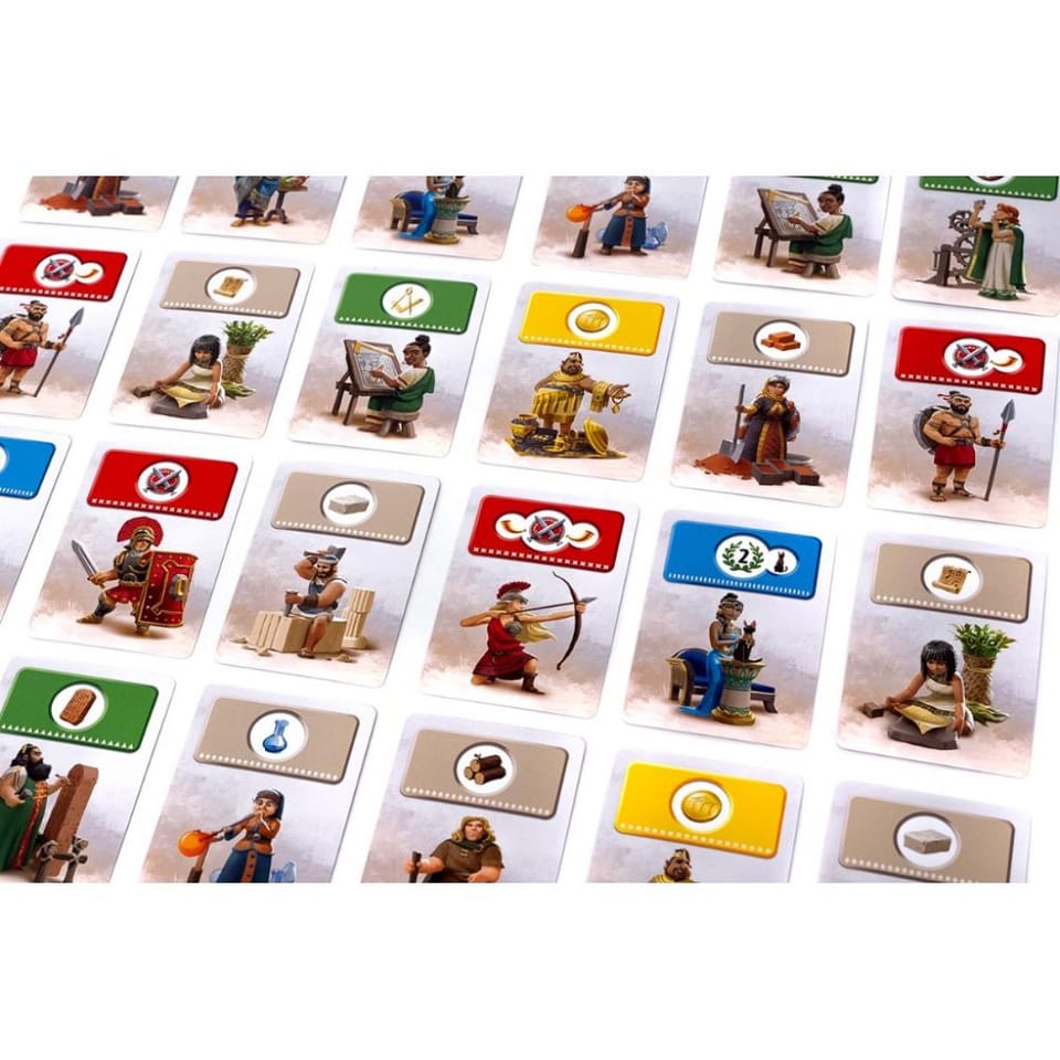 It is a dynamic family game, perfect for the beginning of an adventure with board games. During the gameplay you try to build your own building, making the best use of the available effects and possibilities. In your turn, you choose one of three cards with different characters to help you acquire raw materials to build wonders, make scientific discoveries and fight battles with your neighbours.