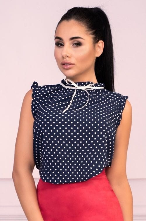 Beautiful, navy blue blouse with small, white dots. With a cute ribbon around the neck. Sleeveless version, finished here with a mini frill. Composition: 95% polyester, 5% elastane.