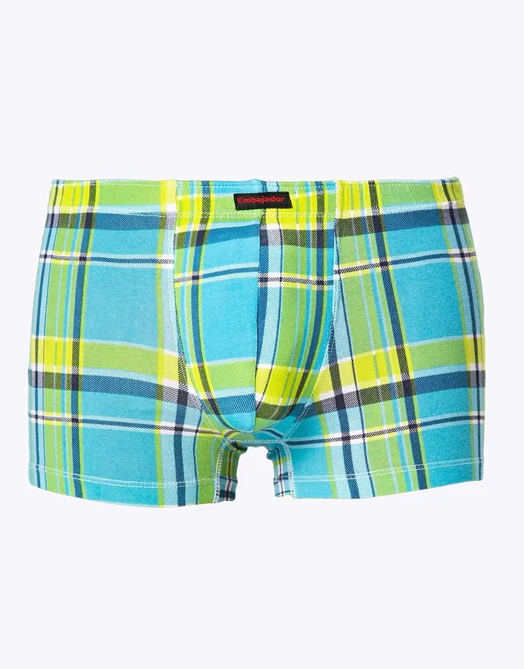 Stylowe szorty męskie z wyprofilowanym frontem, wykonane z przyjemnej dla ciała bawełny (95%) z dodatkiem elastanu (5%). Miękki nadruk w nowoczesną kratę.