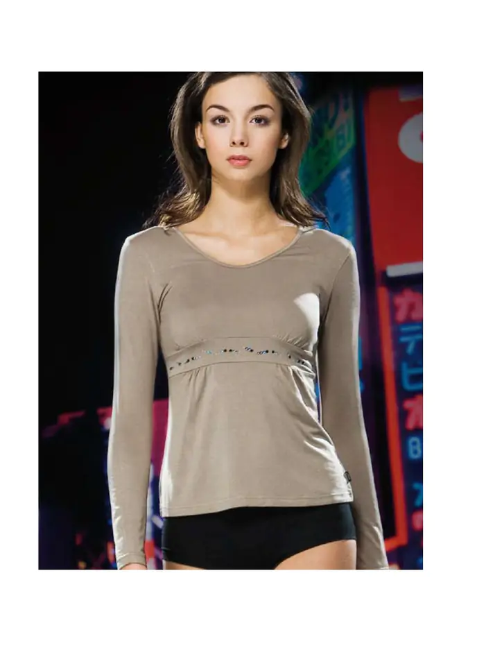 Koszulka damska z długim rękawem, wykonana z miękkiej, przyjemnej dla ciała dzianiny. Odcięta pod biustem i lekko rozkloszowana, Z przodu ozdobiona cyrkoniami. Idealna pod żakiet. Skład: 92% modal, 8% elastan.