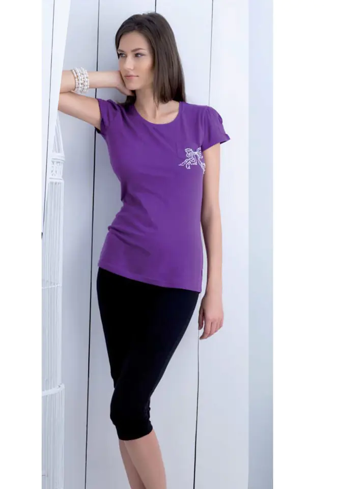 Śliczna koszulka damska z krótkim rękawem. Na piersi naszyta kieszonka oraz modna aplikacja. Materiał: 100% bawełna.