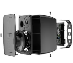 The ARES5A is a 2-way active speaker system consisting of an active and passive unit to be linked with each other. It offers an easy and flexible solution for a wide variety of applications. The 2-way loudspeaker is carefully constructed out of high quality components resulting in a 5 woofer and a high frequency tweeter. This craftmanship in combination with an integrated DSP is creating an extremely clear and powerful sound experience for a wide range of applications.The integrated amplifier can deliver a power of 2 x 40 Watt and includes a stereo line input which is implemented balanced and unbalanced, allowing convenient connection to any kind of audio source. Unbalanced audio sources are connected through a 3.5 mm jack connector, while balanced sources can be connected to the terminal block input connection allowing long signal runs without interference. A volume potentiometer allows the user to adjust the level of loudness while the two-band tone control allows equalization of treble and bass. The auto-standby mode reduces power consumption when no input signal is detected. The active speaker includes a stereo amplifier module, also delivering the input signal to the passive unit.A specially designed bracket system allows close to wall installation of the speakers, while the recessed bracket structure guarantees an optimal cosmetic outlook of the system. The ARES5A can be mounted both horizontally as vertically with an inclination up to 45° on both sides, enabling to position the loudspeaker in the right direction. Due to the fact that the bracket itself consists of 2 45° corners, installation in corners or even ceiling can easily be achieved. The optional MBK455 angled mounting bracket set allows for an extra inclination of 90° when needed.To ensure optimum safety during and after installation, the ARES is equipped with M6 drop safety.A remote input connection implemented through an RJ45 connector allows wall panel connections, allowing expansion of the system through remote input modules. A variety of optional remote input units with different input possibilities is available.