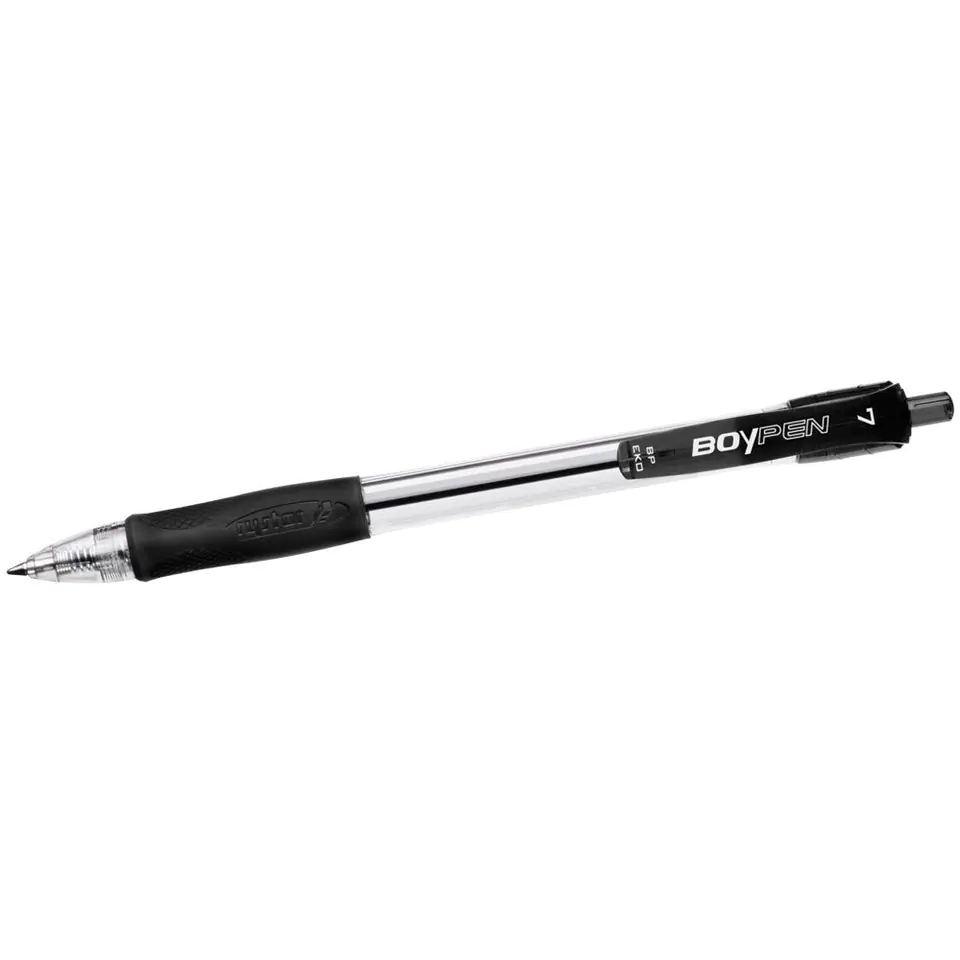 BP-EKO BOY-PEN_ pen - automatic pen for F-120 refills with a tip ensuring lightness and smoothness of writing. Waterproof and non-fading ink. The transparent housing allows you to control the amount of ink, equipped with a rubber handle and clip - dyed in the color of the ink. Cartridge colors: black, red, blue, green.