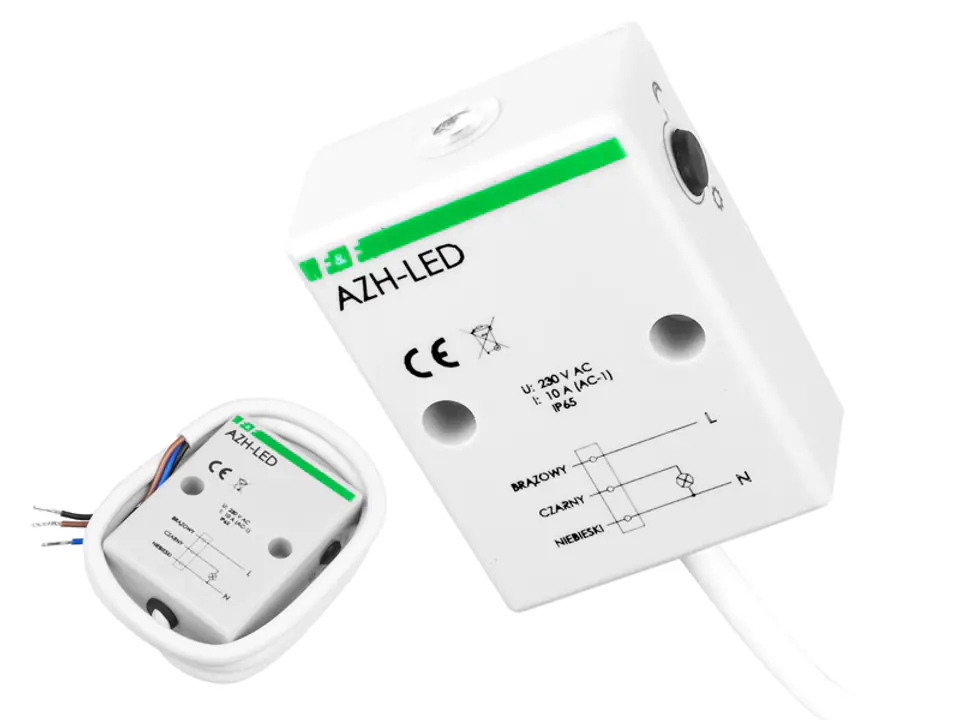 AZH-LED is a twilight automaton with a built-in light sensor, enclosed in a hermetic housing and specially adapted to turn on LED lighting. The AZH-LED twilight automaton will successfully cope with switching on and off LED lighting, which, despite its energy efficiency, generates strong current surges when switched on. These shocks destroy classic relays.