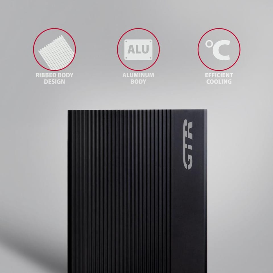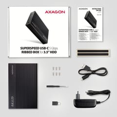 Ribbed aluminum external AXAGON EE35-GTR RIBBED box with USB 3.2 Gen 1 (USB 3.0) interface for 3.5 SATA HDD. The double-sided USB-C connector on the box together with the supplied USB-C -> USB-A cable and USB-A -> USB-C adapter enables a reliable connection to a computer.