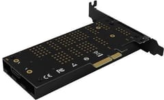 Other features: Full Plug and Play support. Support of M.2 disks of any size - 2230, 2242, 2260, 2280, 22110 mm. Support of M.2 disks of any capacity. Simultaneous operation of both disks. Support of both one-sided and double-sided M.2 disks. A better dissipation of heat from M.2 SSDs thanks to copper-plated vents. A metal cover with fan supplied from the card. An auxiliary fin cooler to provide a superior cooling option for M.2 SSD. Support of booting from SSD card. No drivers need to be installed. Card dimensions: 140 x 68 x 17 mm, weight 111 g. Note: CAUTION! The adapter allows to insert B+M-key disks in both M.2 slots. It is important to check the disk parameters, i.e. to make sure whether the disk is designed for SATA or NVMe (PCI-Express) interface, and to connect it to the right slot. SATA SSDs are connected to B-key slot, NVMe SSDs are connected to M-key slot.