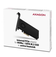 Package contains: PCI-Express adapter with a standard blanking plug and a cover with fan, passive cooler for M.2 SSD and 2 thermal pads, low profile blanking plug, mounting material and a screwdriver, printed installation manual CZ / EN / DE / ESP / FR / HU / IT / PL / RO / RU / SK / BG, packed in a cardboard box with clearly indicated parameters.