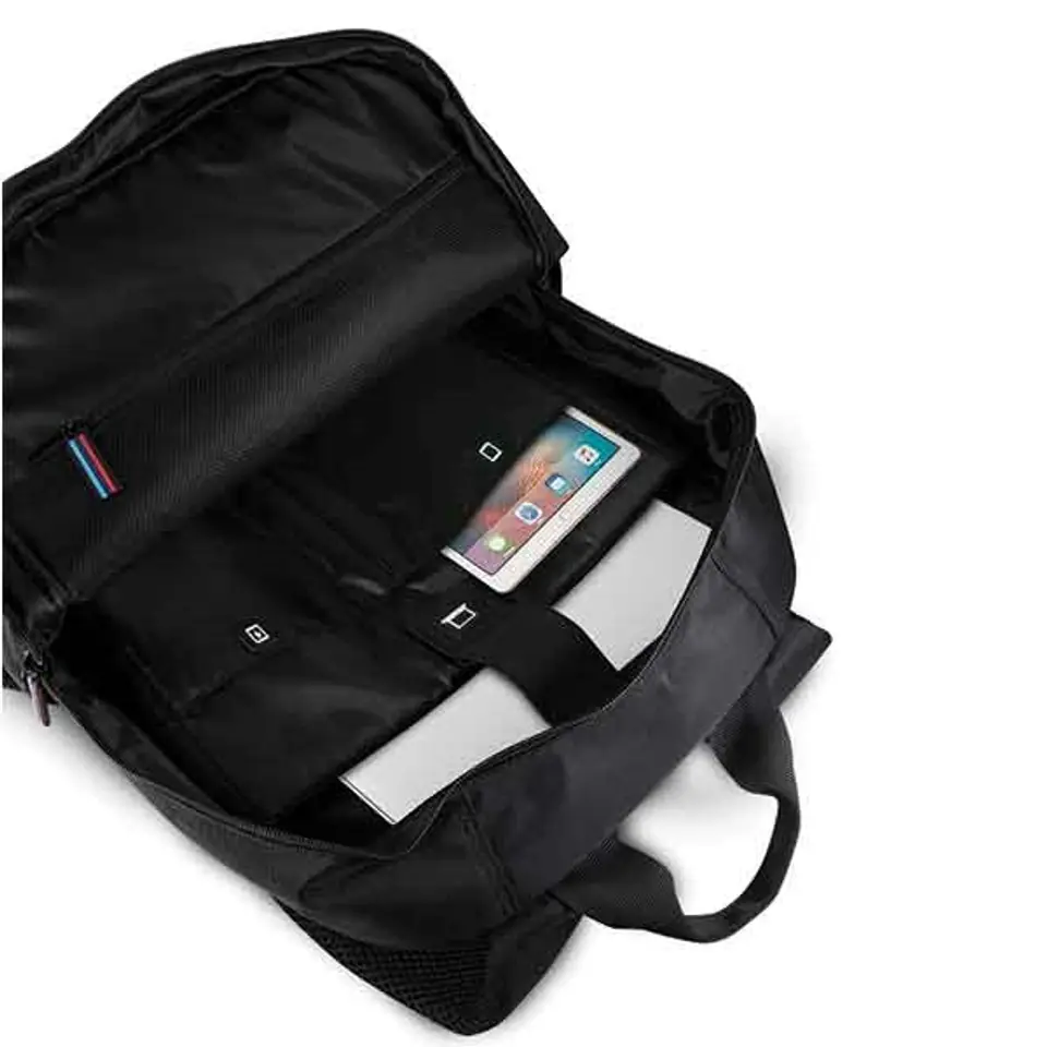 Carry your favourite laptop and tablet in a stylish BMW backpack, made of high-quality nylon and eco leather with polyester lining and double compartments to keep your devices safe.