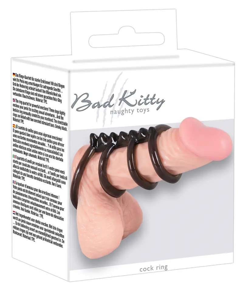 Four rings for the penis. Rings with a diameter: 3 x 2.3 cm and 1 x 4.3 cm. Total length: 6.5 cm. Black. Material: TPE, phthalate free according to EU Regulation 1907/2006/EC.