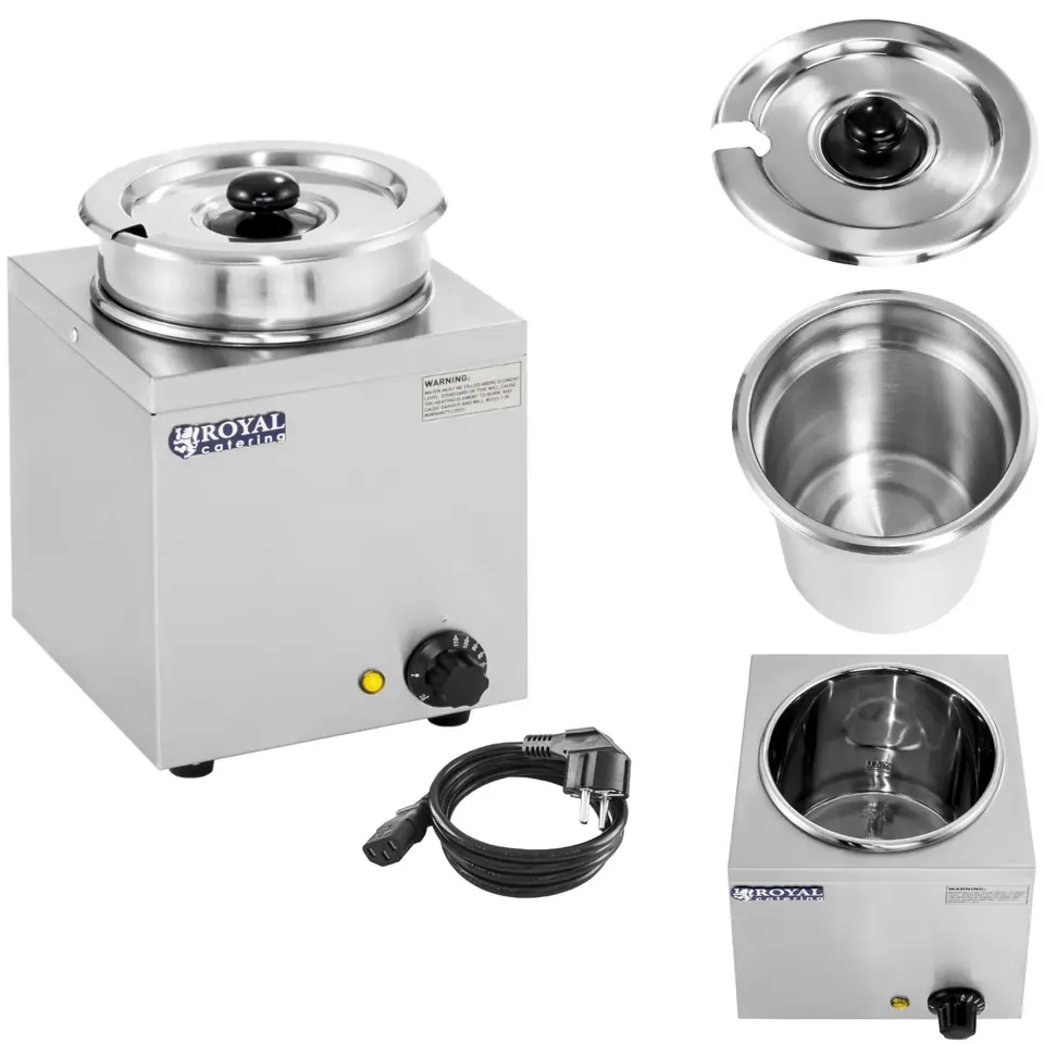 Manufacturer number: RCBM-1/4R The station, electric soup heater of the Royal Catering brand RCBM-1/4R is designed for use in the HoReCa industry. It will work in places where dishes are prepared for a larger number of people: in buffets, hotels, restaurants, in kitchens at camps and camps. Thanks to its simple operation, the bain-marie hot pot will successfully serve as an element of the Swedish table at a banquet. The stainless steel from which the device is made is safe for food. The RCBM-1/4R has a 2.75 l filling chamber ideal for cooking and heating soups, sauces and other dishes. RCBM-1/4R product features and functions: