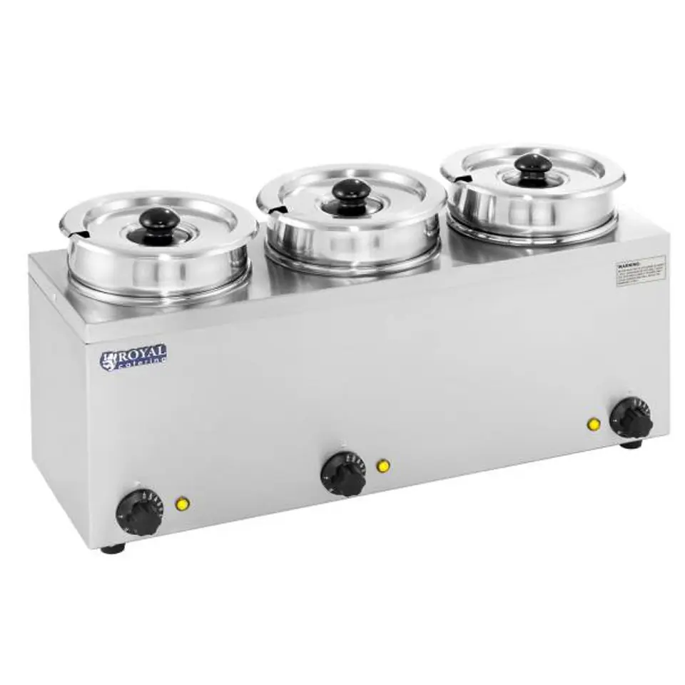 Royal Catering soup station RCBM-3/4R is designed for use in the HoReCa industry. It will work in places where dishes are prepared for a larger number of people: in buffets, hotels, restaurants, in kitchens at camps and camps. Thanks to its simple operation, the bain-marie hot pot will successfully serve as an element of the Swedish table at a banquet. The stainless steel from which the device is made is safe for food. The RCBM-3/4R has 3 separate chambers (with a filling capacity of 2.75 l) ideal for cooking and heating soups, sauces and other dishes.