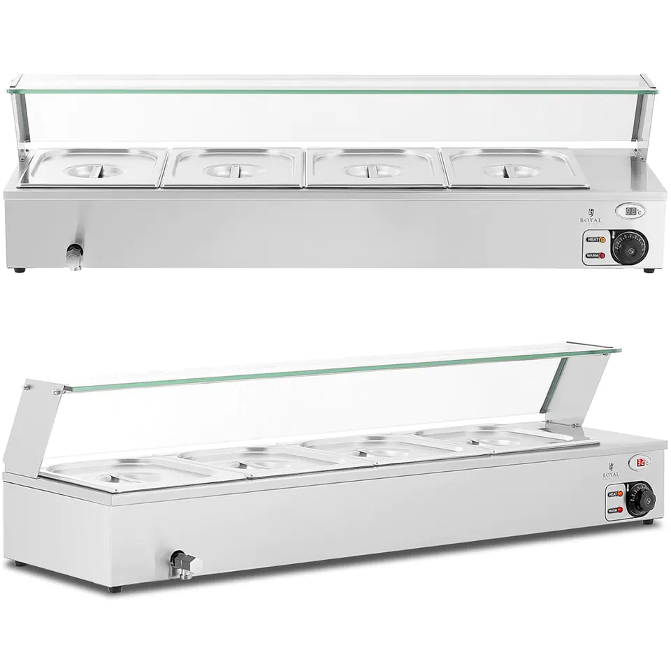 Gastronomic bain-marie by Royal Catering will work in restaurants, buffets, canteens or bars to keep food warm. The device has a power of 2000 W. Temperature regulation occurs in the range of 30-110C. Bain-marie works on the principle of convection, the heating element heats the water between the device and the GN containers and transfers the heat to the containers, without the risk of burning. The large capacity of 4 x GN 1/2 (4 x 4.7 l) allows you to heat several different dishes at the same time. Other sizes of GN containers can be used in the device and combined with each other. The bain-marie is made of stainless steel, durable, corrosion resistant and hygienic. The drain faucet makes it easy to empty and clean the device. Tempered glass cover protects food from dirt. Rubber feet provide stability and do not scratch the ground.