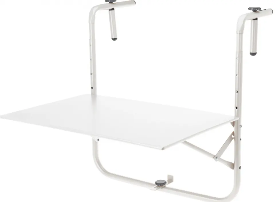 Balcony table in white for hanging folding 60x43cm Hanging balcony table is an ideal solution for small size balconies. It can serve as a coffee table, but also as a table for plants. The table is adjustable and can be easily folded. Thanks to the adjustable brackets, this copy fits on any handrail. Folding balcony table has dimensions of 60 x 43 cm. TECHNICAL DATA Dimensions: 60x43 cm, Color: white, Thickness: 0.7mm, Material: steel, Weight: about 3.5 kg,