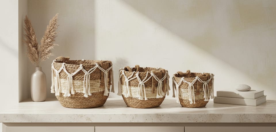 A beautiful set of 3 baskets in natural shades with interwoven white strings. The set of baskets comes from the BALI series by MONDEX.