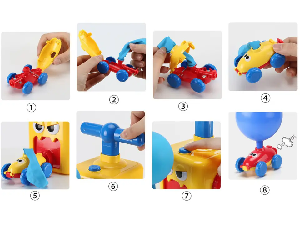 The balloon launcher works in a very simple way. It is enough to place a balloon in the toy and connect it to the launcher. Then, using a pump, we blow the balloon and release the blockage. A car or rocket rushes ahead and is driven only by air escaping from the balloon. You don't need any batteries for this fun. Great fun - guaranteed.