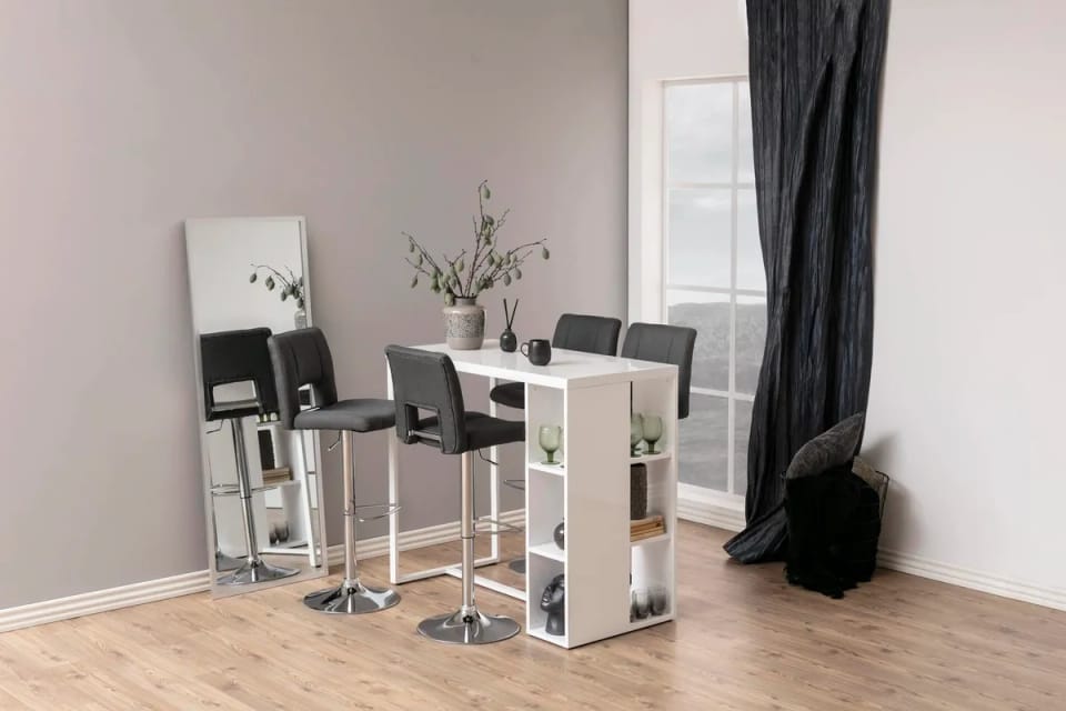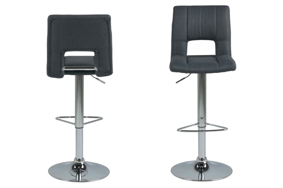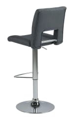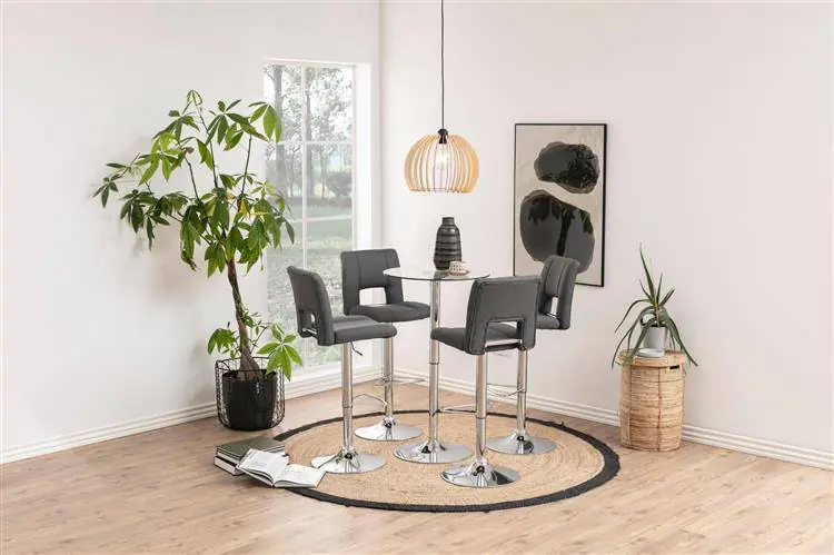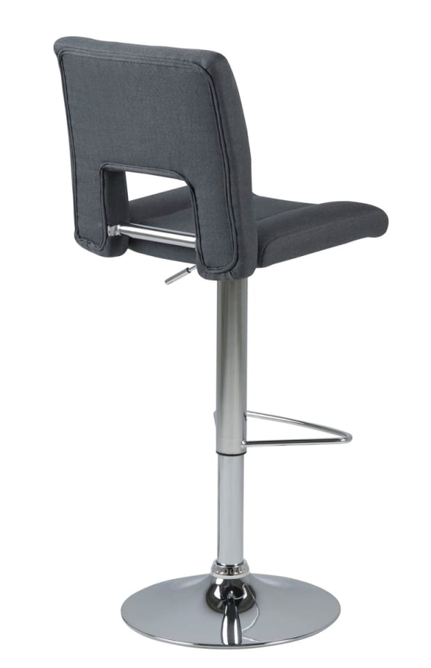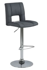 The Grace-6 bar stool has a comfortable seat in gray. The notch on the backrest gives it a stylish look. Set on a round, chrome-plated base, it is equipped with a semicircular footrest. It also has an adjustment function, which makes it easy to adjust the height of the seat to the table top.