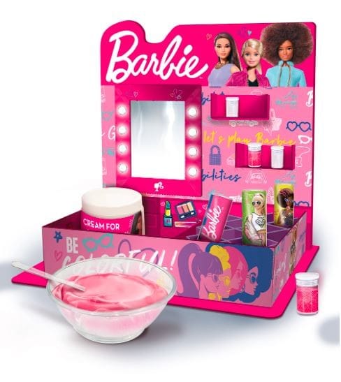Discover the world of Barbie lipglosses that change colour! Have fun creating colourful compositions with the fantastic kit you'll find in the pack! Using an extraordinary thermochromatic and photochromatic powder, your glosses will change colour when exposed to water or light. Endless fun guaranteed! You can assemble a personalised Barbie dressing table and use it to store your glosses.... and more!