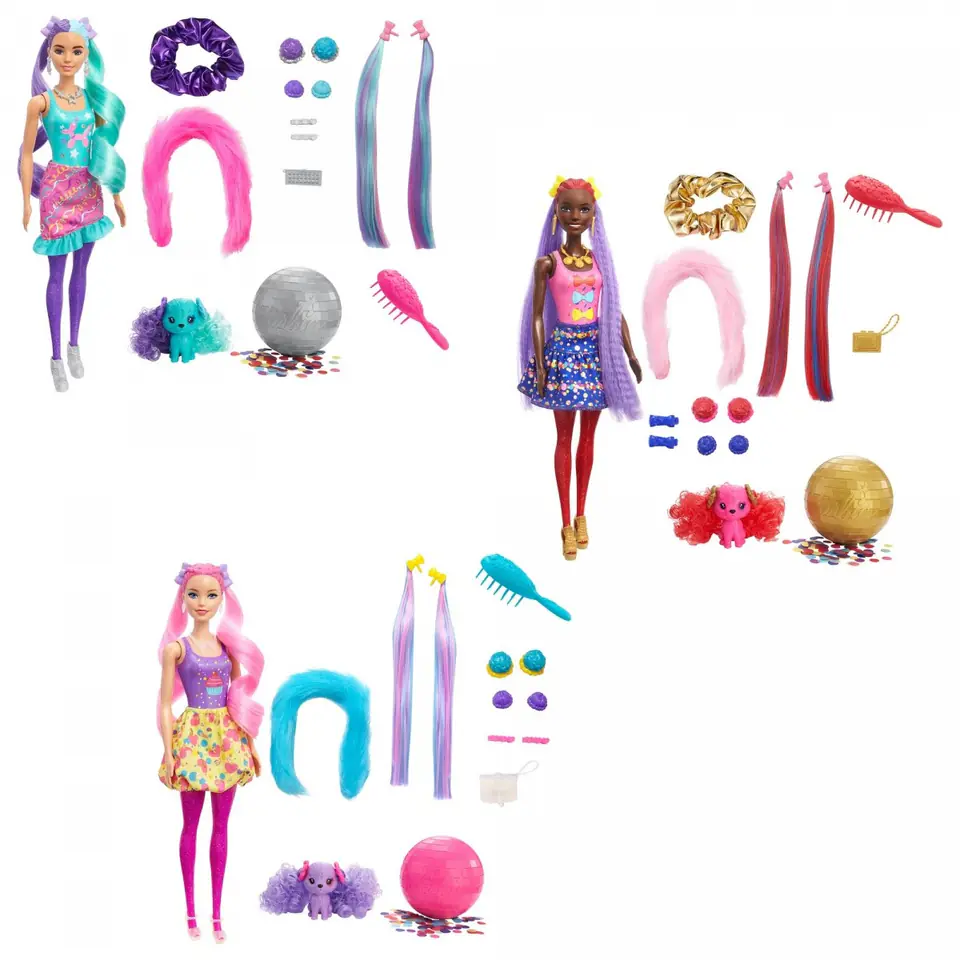 Barbie Color Reveal Fashionable Hairstyles dolls provide fun filled with amazing discoveries! This set contains 25 surprises open the front panel to reveal 15 surprise bags and a tube shaped like a bottle of hairspray. Take out the glitter Barbie Color Reveal doll and fill the tube with warm water, then put the doll inside and move it around. The water changes colour and sparkles with glitter particles for a magical effect. When you pull the doll out you will discover her appearance! Additional surprises include 10 attachable hair pieces, an animal figure, clothing, accessories, a disco ball with confetti and more. Use the included highlights and accessories to create unique hairstyles and enjoy creative fun with your Barbie doll and her pet. Prepare the hairstyles and then swap them out. There are lots of crazy hairstyles to try! And the surprises don't end there. Use cold water to activate colour changes on the doll's lips and eyes and on the pet's muzzle. Using hot and cold water, you can repeat this wonderful moment as many times as you want! Sold separately, subject to availability. Dolls do not stand alone. Colours and decorative elements may vary.