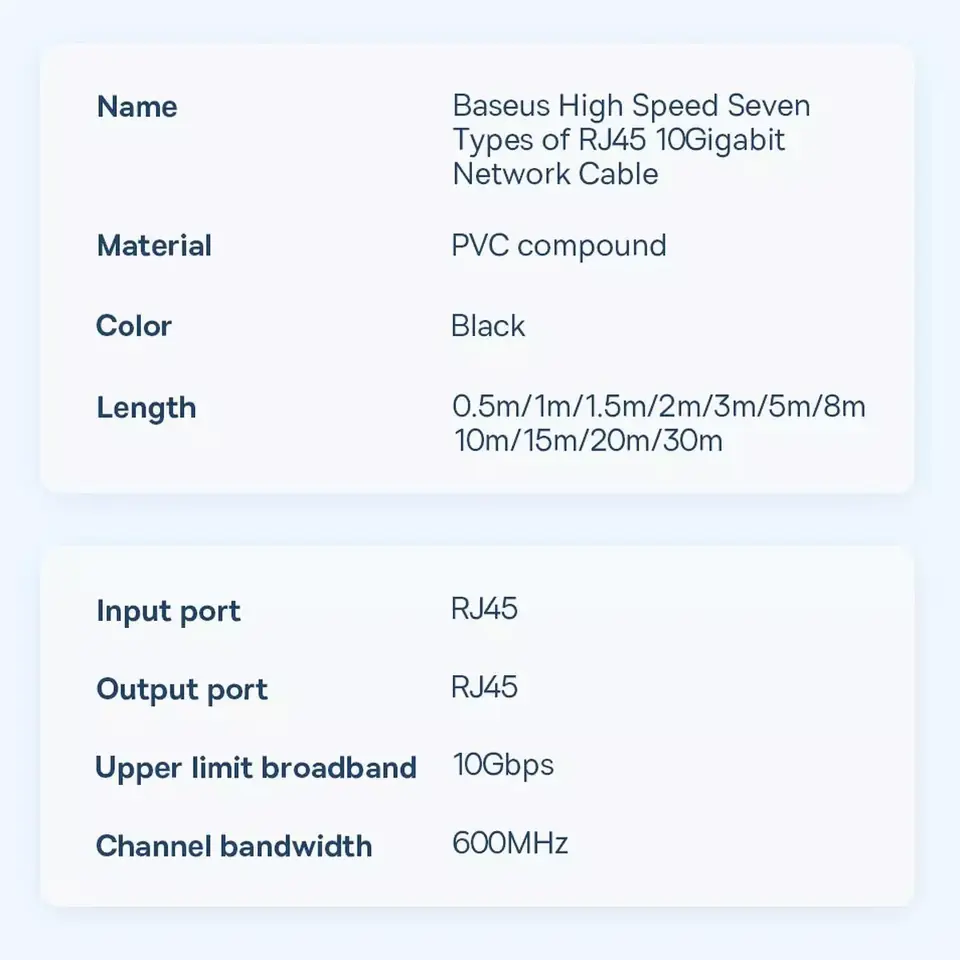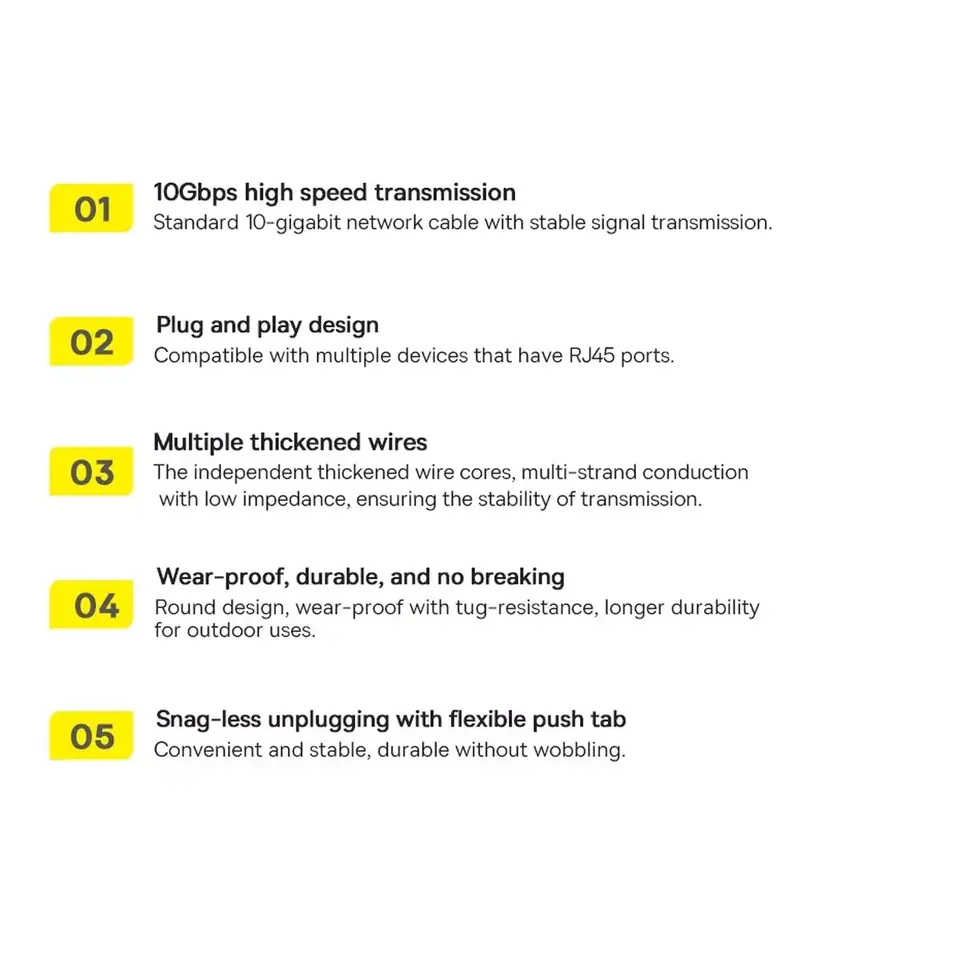 Get convenient access to lightning-fast internet! The Baseus network cable offers up to 10 Gbps bandwidth and is compatible with RJ45 ports. High-quality materials guarantee constant, stable transmission, and the use of the Plug & Play system ensures a rapid start of operation.