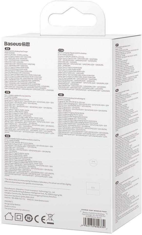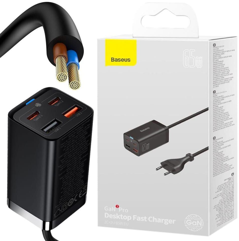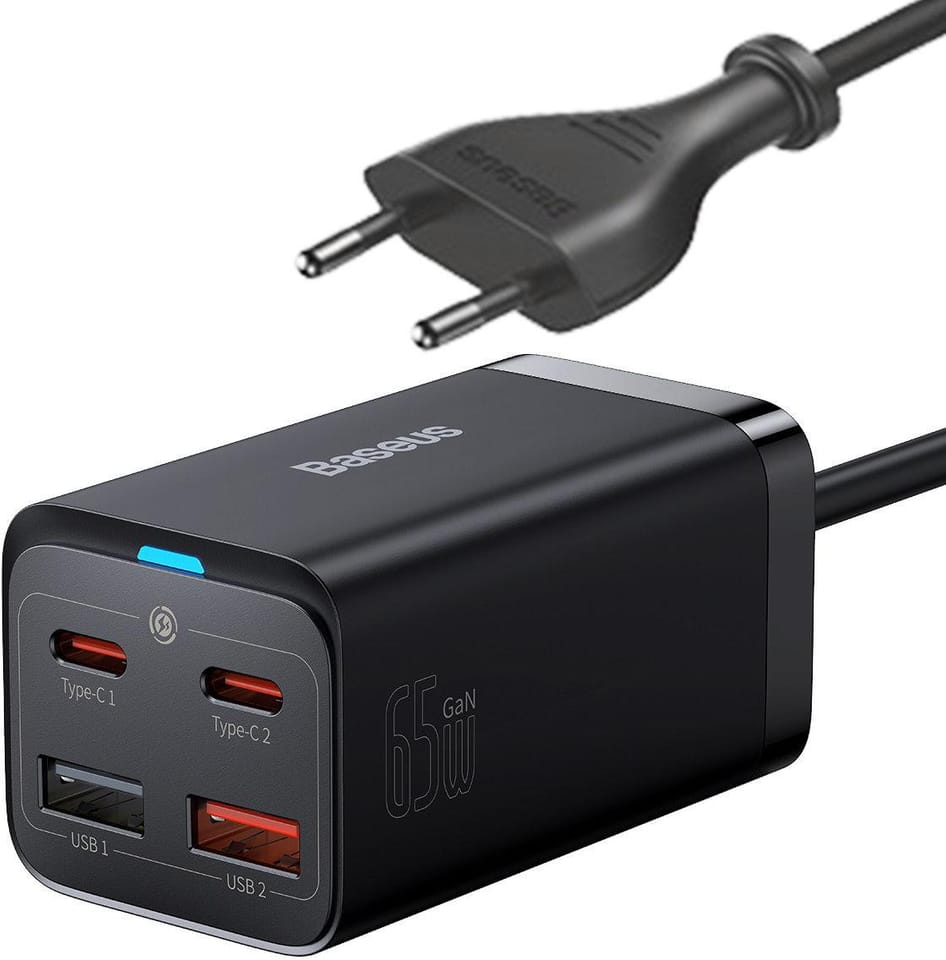Baseus' patented Power Split system detects and adjusts power to the connected device to protect its battery. GaN3 technology, on the other hand, is responsible for efficient energy conversion, offering a total of 65 W. What's more, its use also affects the lightweight design of the charger and prevents it from overheating.