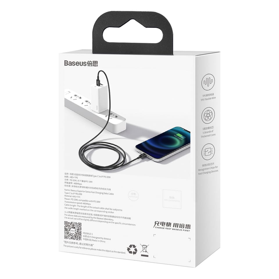 USB-C - Lightning cable designed to charge and sync most devices from Apple. It supports fast power supply up to 20W (backward compatible) and enables data transfer rates of up to 480Mbps. It supports the Power Delivery 20W standard that allows for ultra-fast charging of new iPhones.
