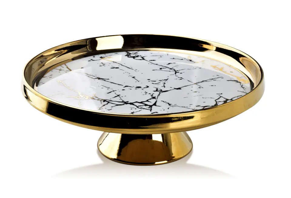 Porcelain patera from the BASIC series. White patera with gold border and marble.