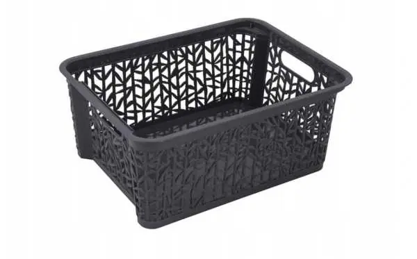 Basket container organizer in anthracite color 23.5x17.7x8.5cm Inspired by oriental nature, the basket will be a decoration of many a shelf. The motifs of bamboo twigs and leaves create a very original product. The unique housing equipped with matching edges allows you to stack containers on top of each other. This solution helps to maintain order throughout the house. Technical data: Material: plastic, Color: anthracite, Dimensions: 23,5x17,7xH 8,5cm,