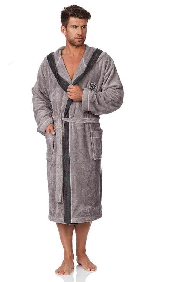 Ciekawy, gładki szlafrok z kapturem. Dobrze leży, jest wiązany w pasie, na biodrach ma dwie kieszenie. Lamówka w kontrastowym kolorze nadaje mu ciekawego charakteru. U góry naszywka. Produkt polski, wysoka jakość. Skład: 100% poliester.