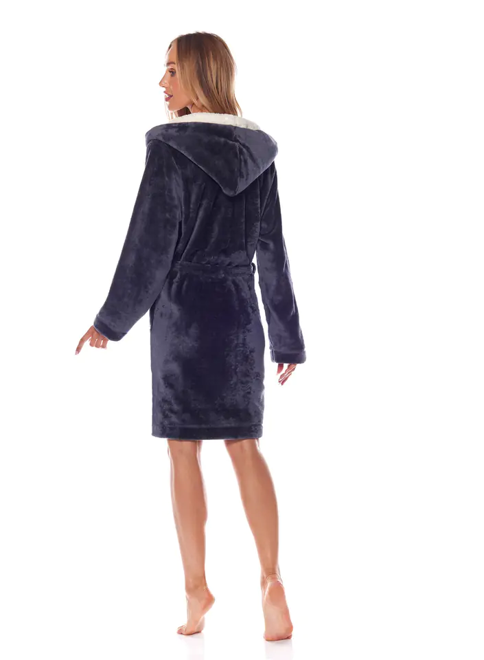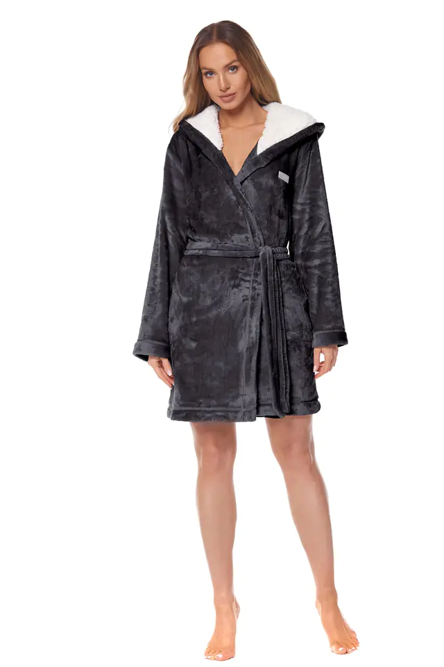 Szlafrok damski krótki z kapturem, wiazany w pasie. Kaptur od środka obszyty przyjemnym futerkiem. Skład: 100% poliester.