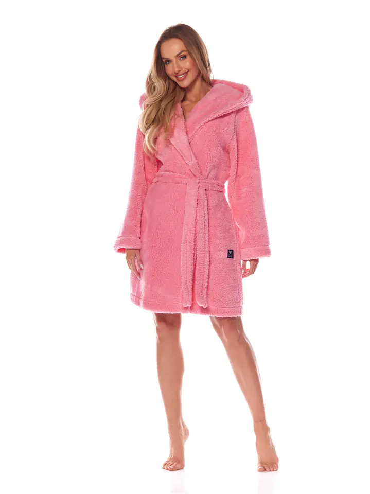 Women's short bathrobe with a hood made of soft and pleasant knitwear. Tied at the waist, with pockets. Composition: 100% polyester.
