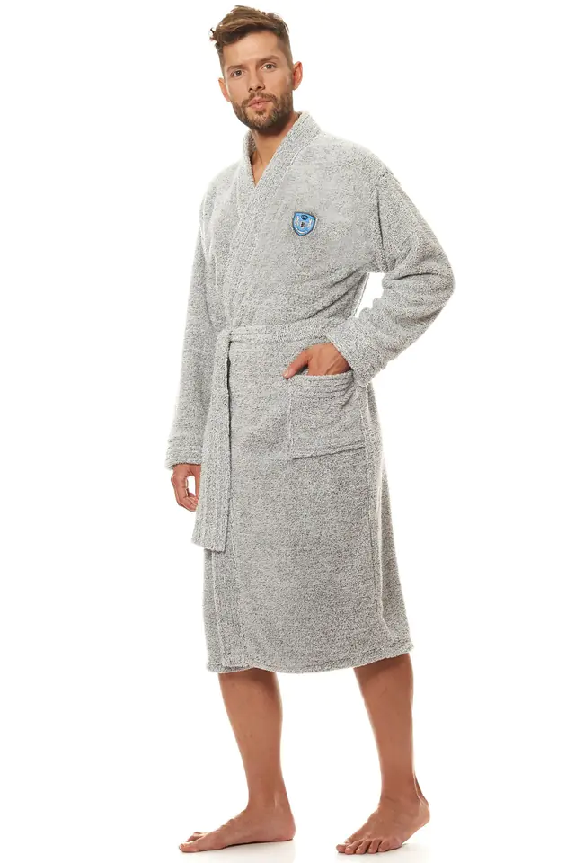 Klasyczny szlafrok męski, wiązany w pasie, z miękkiej dzianiny soft. Na biodrach kieszenie, na wysokości klatki piersiowej naszyta aplikacja. Miły i przyjemny w dotyku.