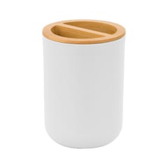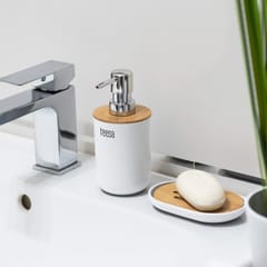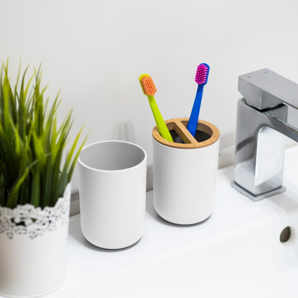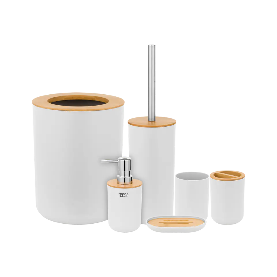 It includes such bathroom accessories as a soap dish, soap dispenser, mug, toothbrush cup, as well as a toilet brush and trash can. All bathroom accessories are made of high quality plastic with the addition of bamboo wood.