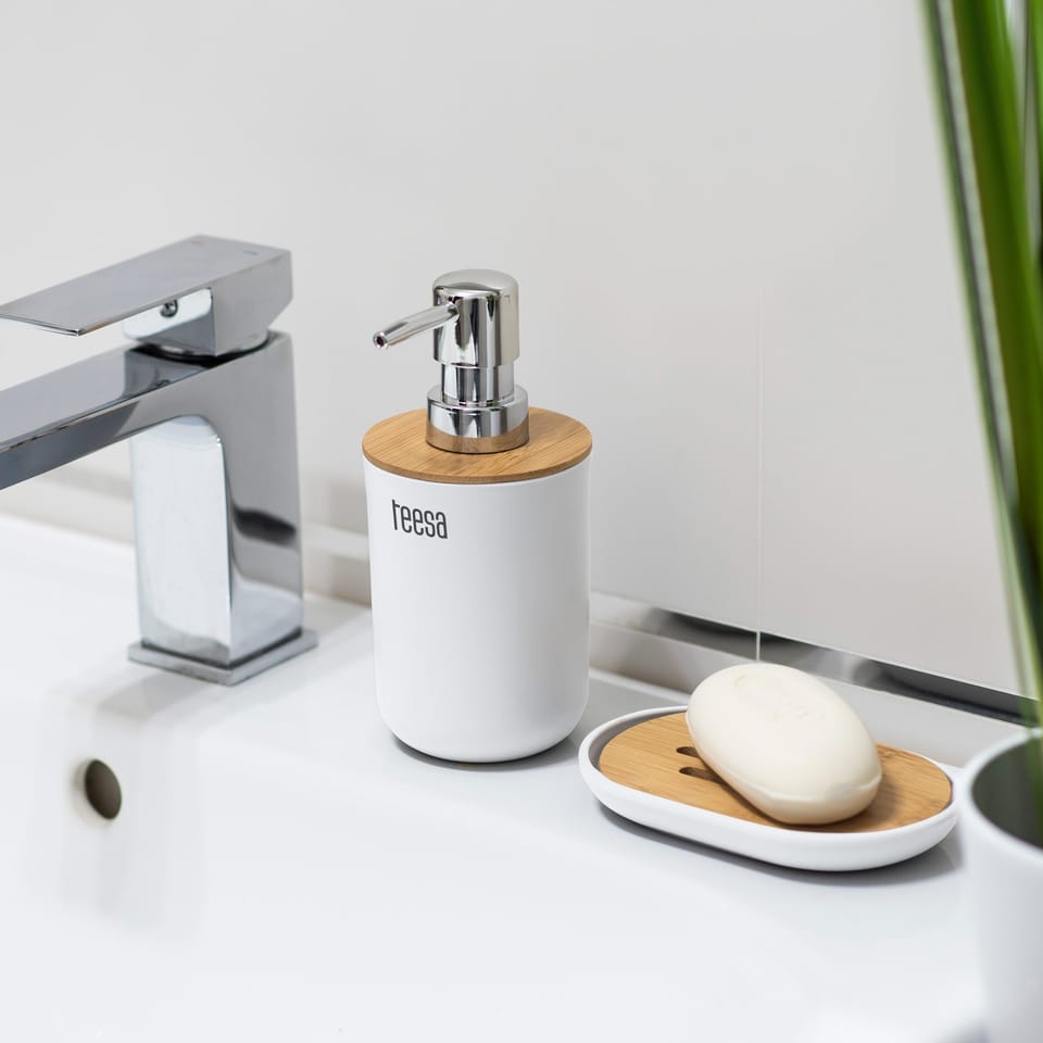 Teesa white bathroom accessories Are you looking for practical and elegant accessories that will naturally blend into the interior of your bathroom and will serve for years? The 6-piece set of Teesa bathroom utensils will meet your expectations.