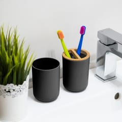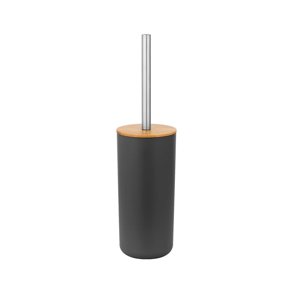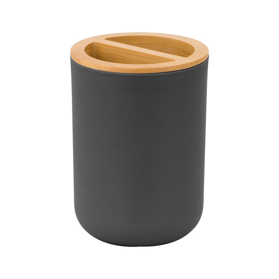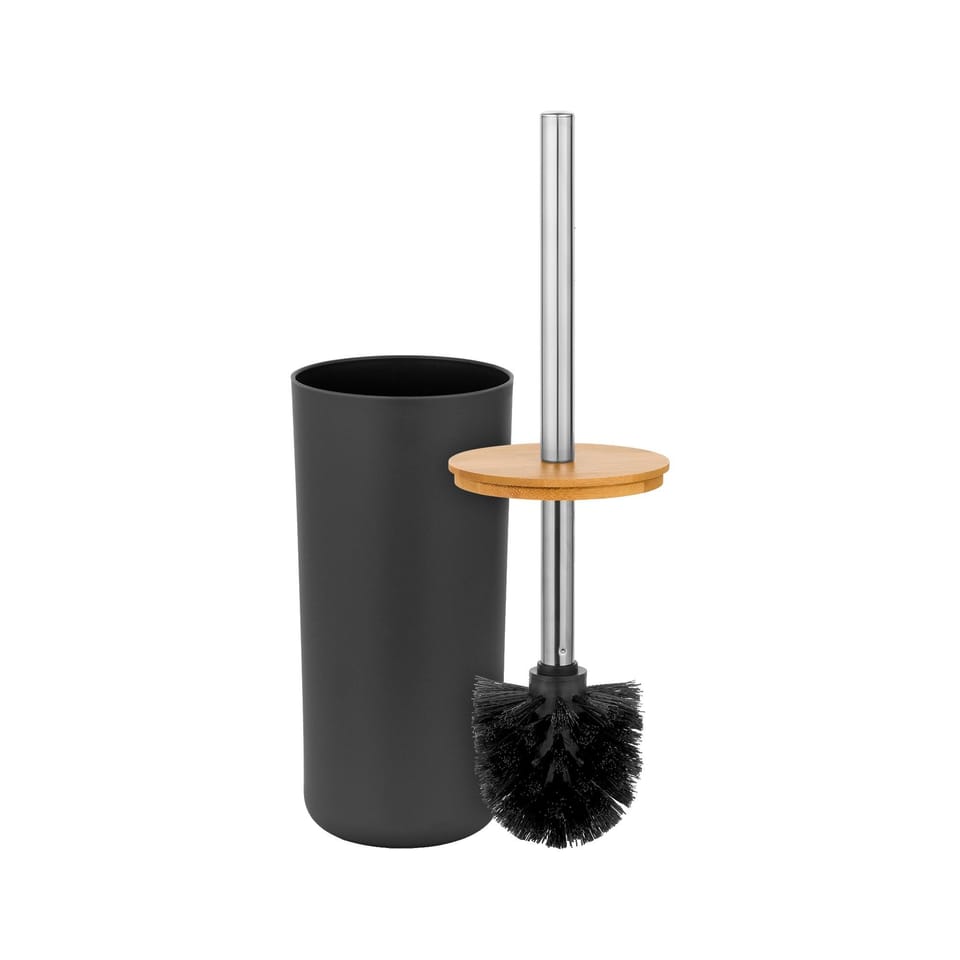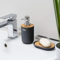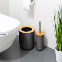 It includes such bathroom accessories as a soap dish, soap dispenser, mug, toothbrush cup, as well as a toilet brush and trash can. All bathroom accessories are made of high quality plastic with the addition of bamboo wood.